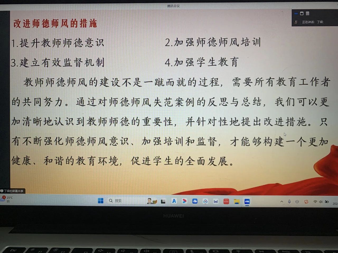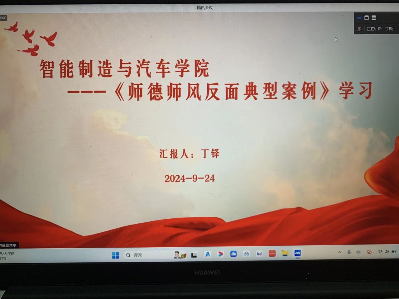 为进一步加强师德师风建设,提升教师队伍素质,2024年9月24日晚上19:30,智能制造与汽车学院在腾讯会议平台上成功开展了以“铸就高尚师德,塑造良好师风”为主题的第二场师德巡讲活动。本次活动得到了学院全体教职工的积极参与。