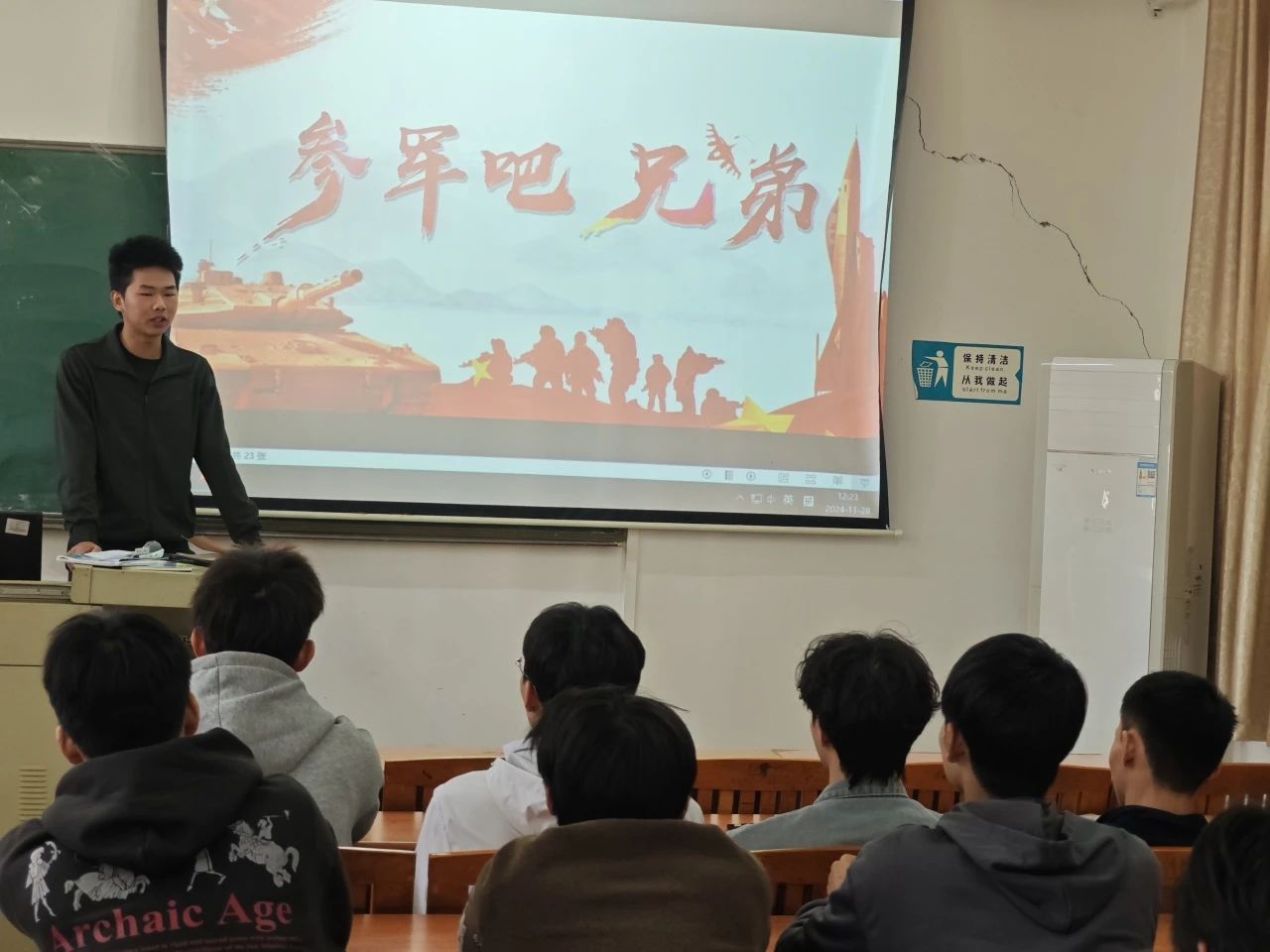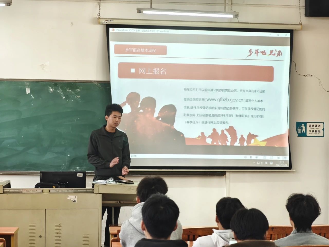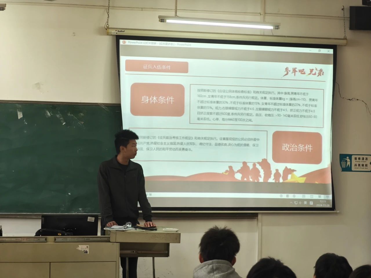活动伊始,宣讲人首先向同学们概述了入伍的基本条件,包括年龄、学历、身体素质等方面的要求。通过详细解读相关政策,同学们对参军入伍的门槛有了更加清晰的认识,为有意向报名参军的同学提供了明确的方向。