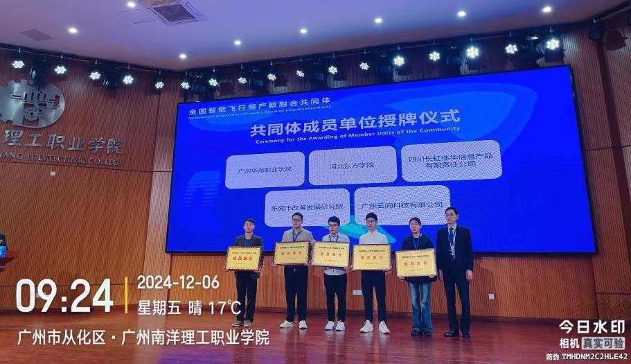 交流结束后由全国智能飞行器产教融合共同体授予我院成员单位牌匾。本次研讨学习将推动我院低空经济人才培养与专业建设迈上了新的台阶,为后续增设申报无人机专业和人才培养营造一个良好的开端。