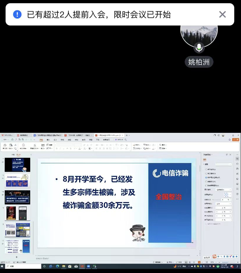 2024年11月12日,智能制造与汽车学院精心筹办的班主任培训会议在线上圆满举行。本次会议紧密聚焦于交通安全、食品安全、防疫安全、反诈防骗、节水宣传等至关重要的话题,旨在全面增强班主任在班级安全管理上的专业素养和能力,以确保学生们的平安与健康成长。本次会议由学院副院长、党总支副书记姚柏洲主持。