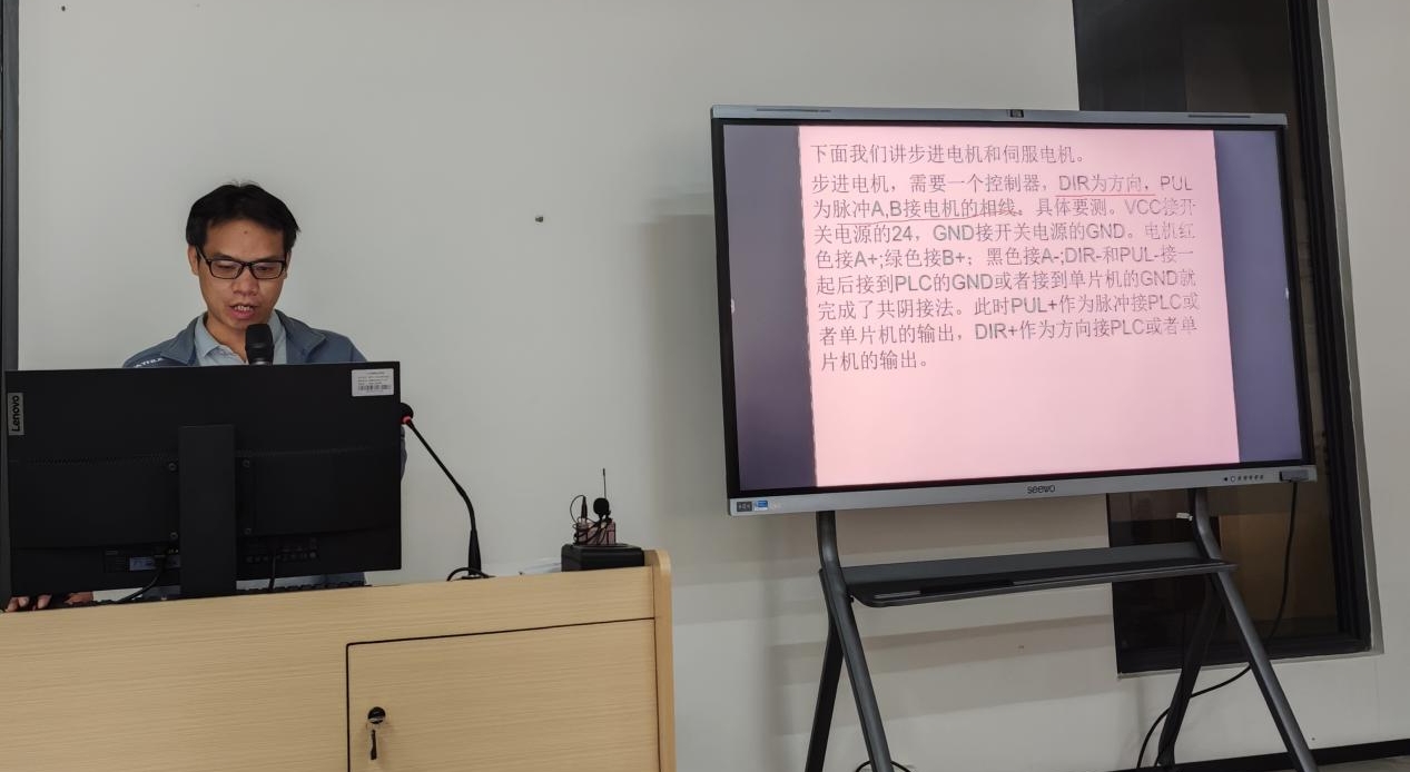 此次培训内容丰富,全面覆盖了PLC控制、行程开关、光电开关、中间继电器、电磁阀、变频器及伺服(步进)电机等核心技术的综合运用。郑汉尚副教授以其独到的见解和深入浅出的教学方式,详尽解析了这些关键技术的内在机理与实际运用,帮助与会教师深刻洞察智能控制系统的整体构造与运作逻辑。