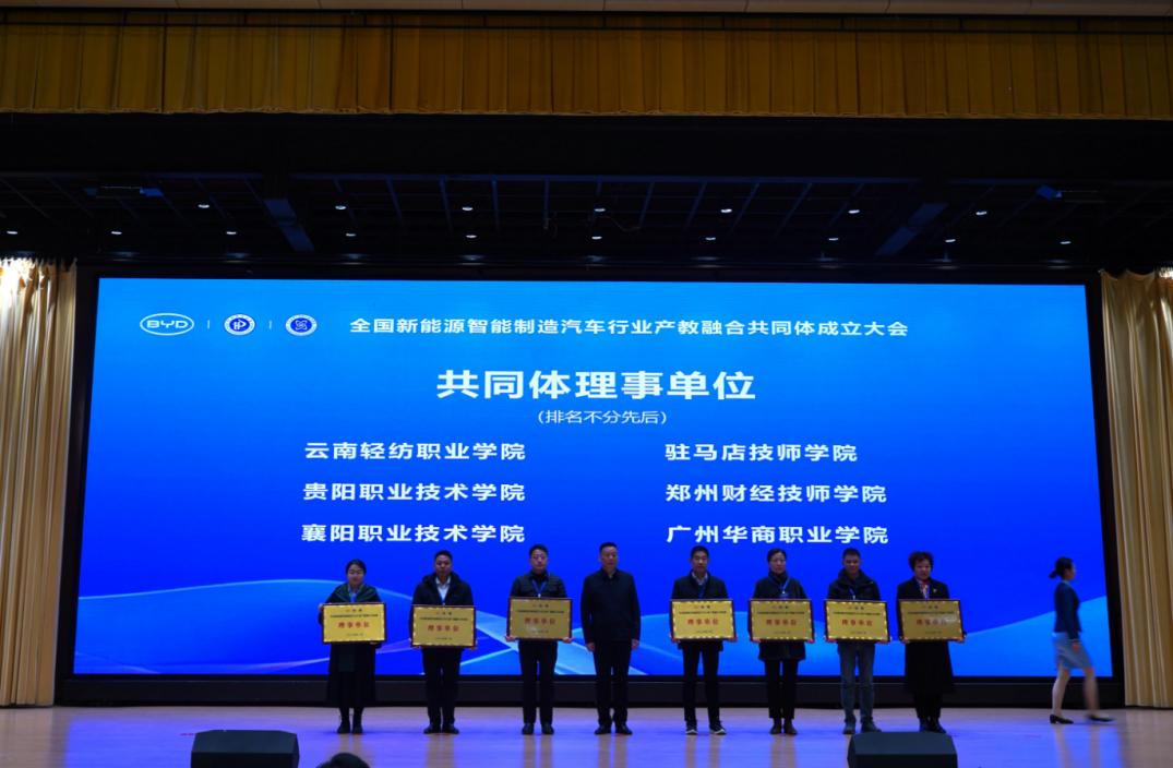 在成立大会前夕,与会代表一致审议并通过了《全国新能源智能制造汽车行业产教融合共同体章程》,并选举产生了19个常务副理事长单位、32个副理事长单位和28个理事单位。值得骄傲的是,我院在此次选举中脱颖而出,成功当选理事长单位,并接受了共同体颁发的理事单位牌匾。这不仅是我院继比亚迪校企合作产业学院成功落地后的又一里程碑,也为我院产教融合事业的发展开辟了新篇章。