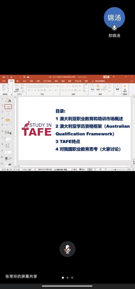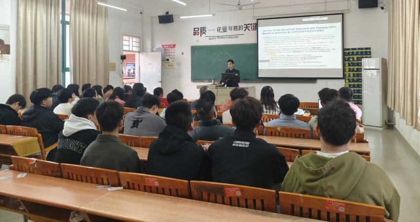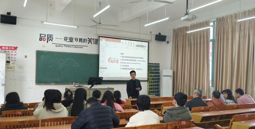 活动开始,郑锦汤副教授介绍澳大利亚职业教育和培训市场,系统解构澳大利亚职教体系,揭示其国家资格框架(AQF)的互通性特征:职业教育与普通教育学分互认机制,构建起“纵向衔接、横向贯通”的立体化教育网络。重点剖析TAFE学院“行业主导、能力本位”的办学特色,深入剖析了澳大利亚TAFE职业教育模式特点以及对我校职业教育启示。
