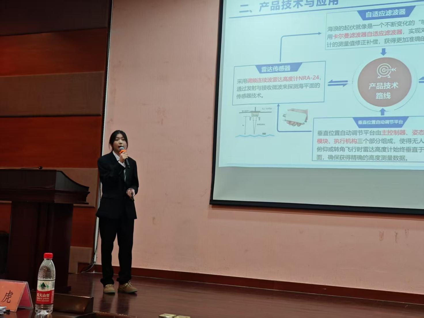 决赛现场,温壹蔓同学作为主讲人,以“无人机技术赋能海洋探索”为主题,通过动态演示与数据对比,生动阐释了项目在精准定高算法、抗干扰通信模块及低成本材料应用上的创新突破。其演讲条理清晰、台风稳健,尤其在阐述无人机于军事隐蔽侦察与海洋环境监测中的实际应用时,赢得评委高度关注。答辩环节中,面对评委提出的技术细节与市场前景问题,曾俊涛、林荣泽两位同学结合实验数据与行业调研逐一回应,逻辑缜密;温壹蔓则从用户需求角度补充案例,三人默契配合,展现出扎实的专业素养与团队协作能力。评委组评价该项目“兼具国防价值与科研实用性,为无人机低成本化提供了可行路径”。