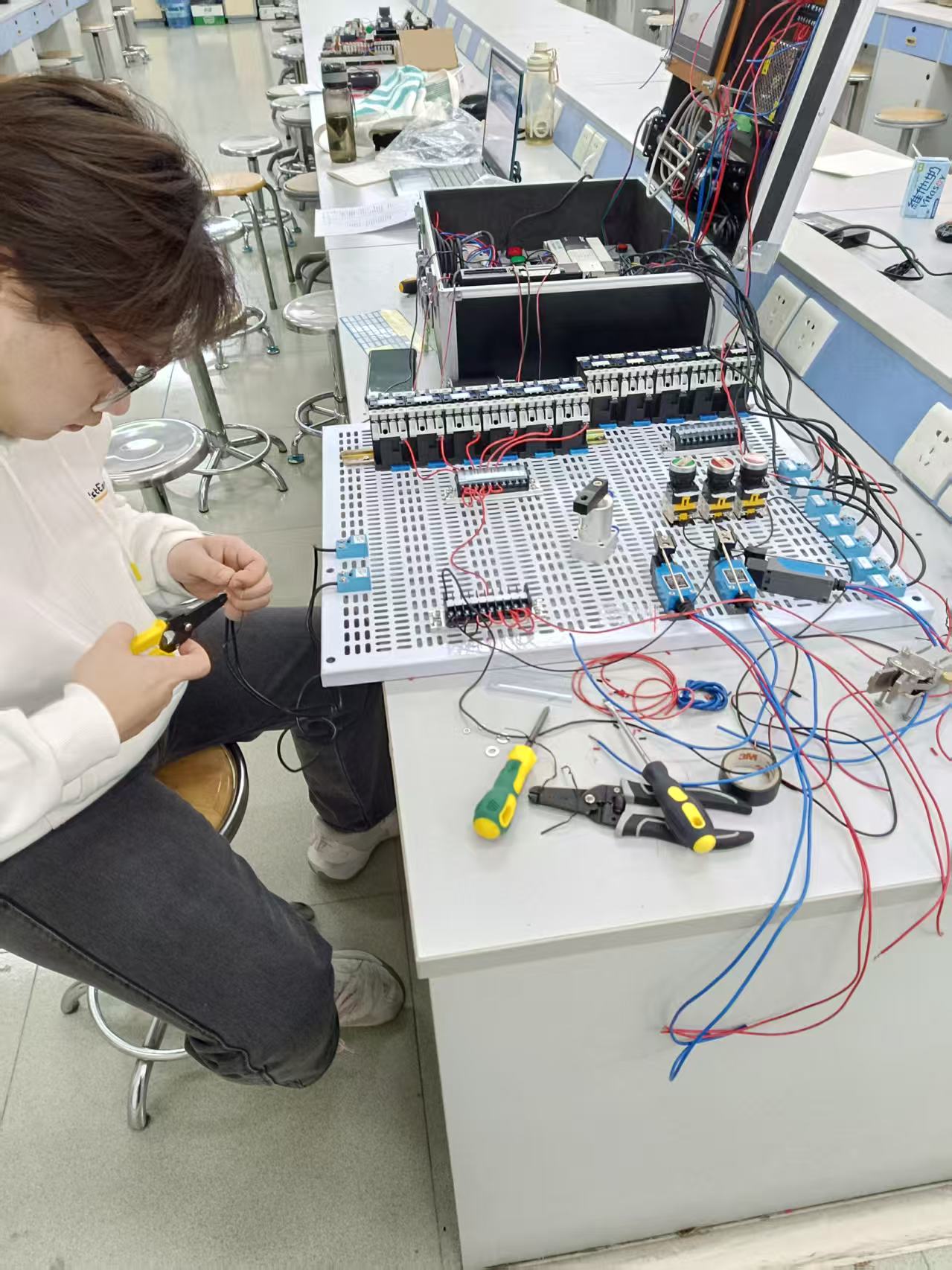 备赛过程中,从2025年2月22日起,师生已经在积极进行赛事的准备工作,积极研究赛题,在缺乏竞赛设备的情况下,师生共同研发一个模拟的工作站进行备赛。备赛过程中,参赛选手积极学习各种传感器的工作原理,通过PLC程序进行逻辑的研究,对样题的5个工作站进行了细致的分工与研究。做到每个工作站有指定的队员进行学习和编写PLC程序。经过分工合作,积极协调,5个工作站进行了有序的分工。