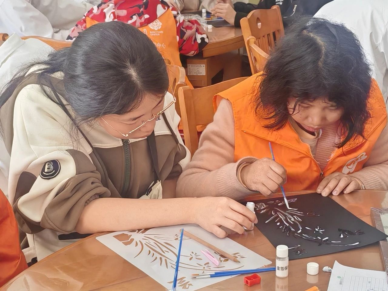 学生党员和入党积极分子们介绍社区情况以及烧箔画的背景和意义,引导社区居民们完成箔艺画,掌握勾线、箔片剪裁与粘贴技巧,体验金属箔在烧制过程中的色彩变化。