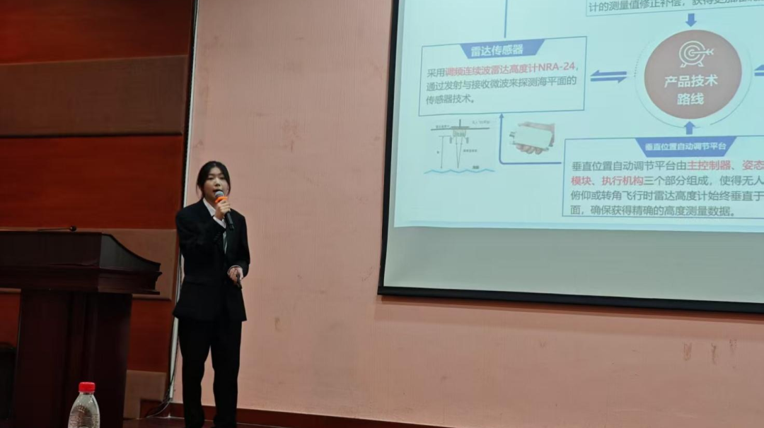 决赛现场,温壹蔓同学作为主讲人,以“无人机技术赋能海洋探索”为主题,通过动态演示与数据对比,生动阐释了项目在精准定高算法、抗干扰通信模块及低成本材料应用上的创新突破。其演讲条理清晰、台风稳健,尤其在阐述无人机于军事隐蔽侦察与海洋环境监测中的实际应用时,赢得评委高度关注。答辩环节中,面对评委提出的技术细节与市场前景问题,曾俊涛、林荣泽两位同学结合实验数据与行业调研逐一回应,逻辑缜密;温壹蔓则从用户需求角度补充案例,三人默契配合,展现出扎实的专业素养与团队协作能力。评委组评价该项目“兼具国防价值与科研实用性,为无人机低成本化提供了可行路径”。