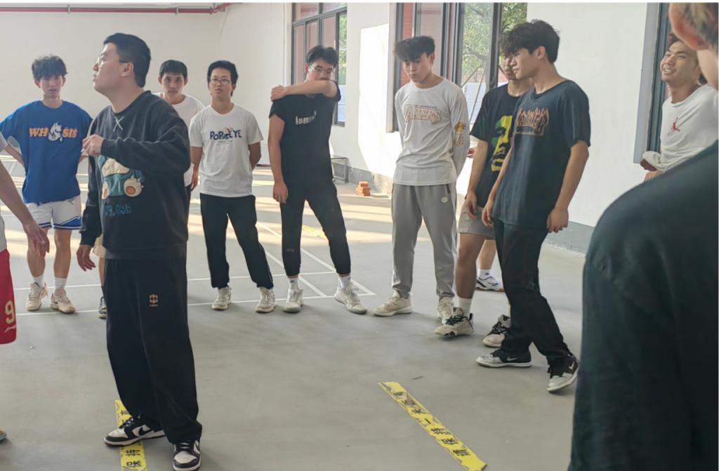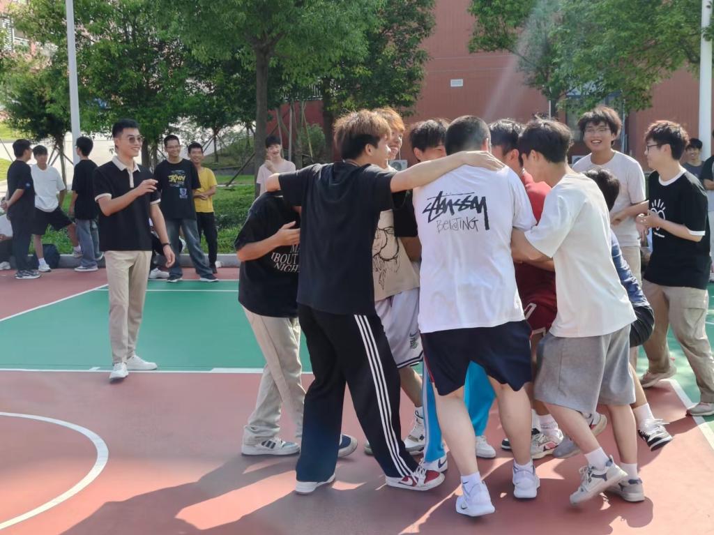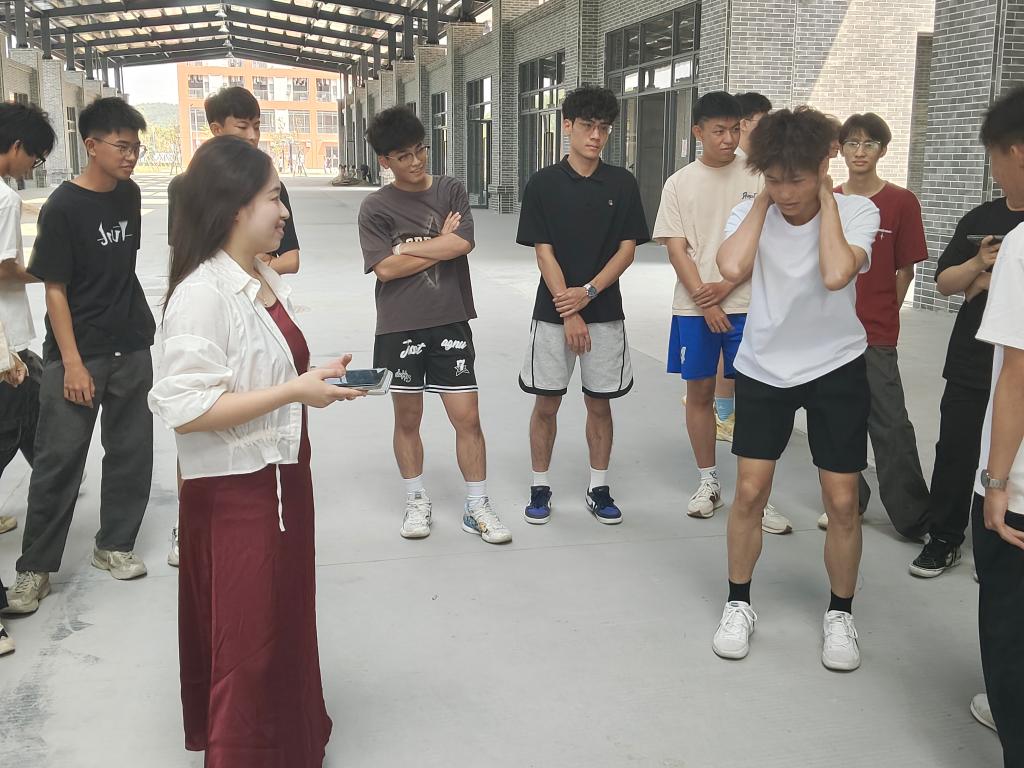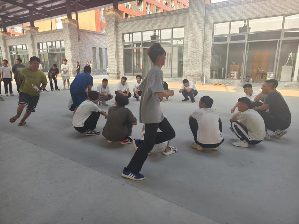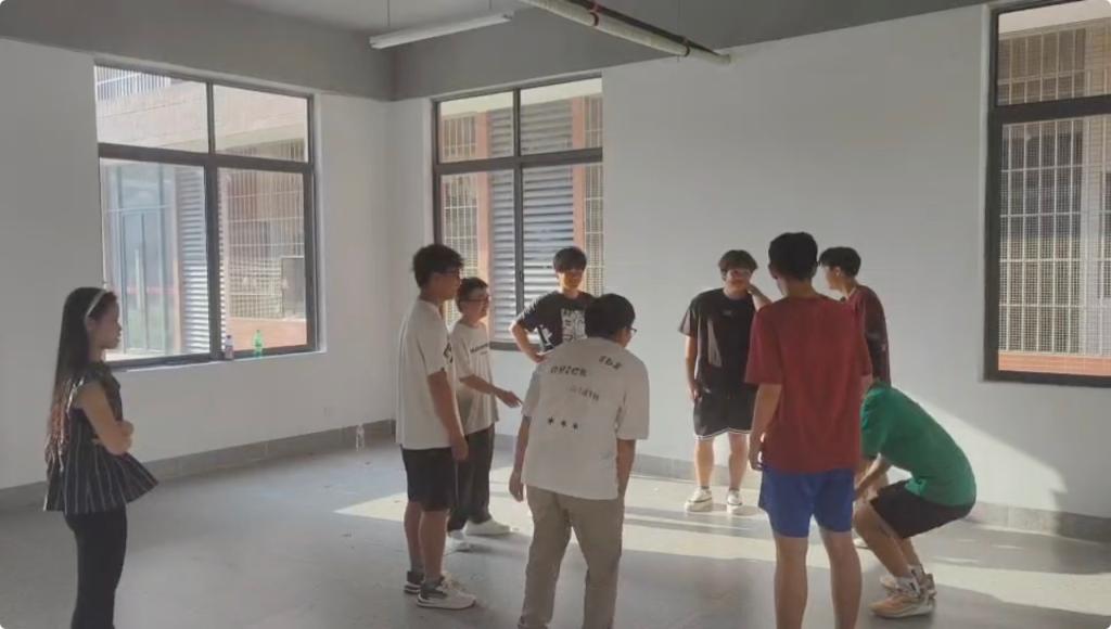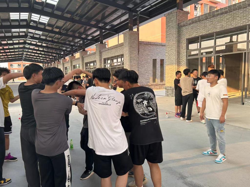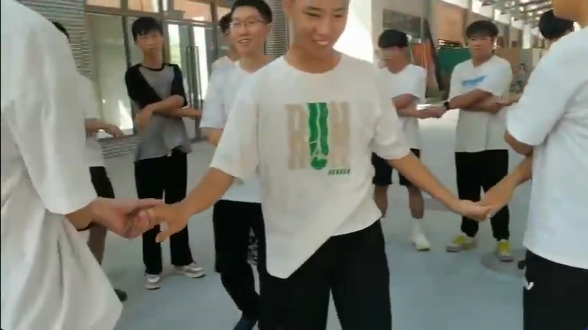 熊鹏程老师、关景福老师、张启卓老师组织的团队合作活动“解手链”。活动中,学生分组手拉手围成圈,记住左右相握之人后散开,音乐停止时再找到原来的人相握,形成 “手链”。大家需在不松手前提下,运用跨、钻等方法将其解成大圆圈。此活动能锻炼团队沟通协作能力,增强成员默契,让大家感受合作乐趣与团队力量 。