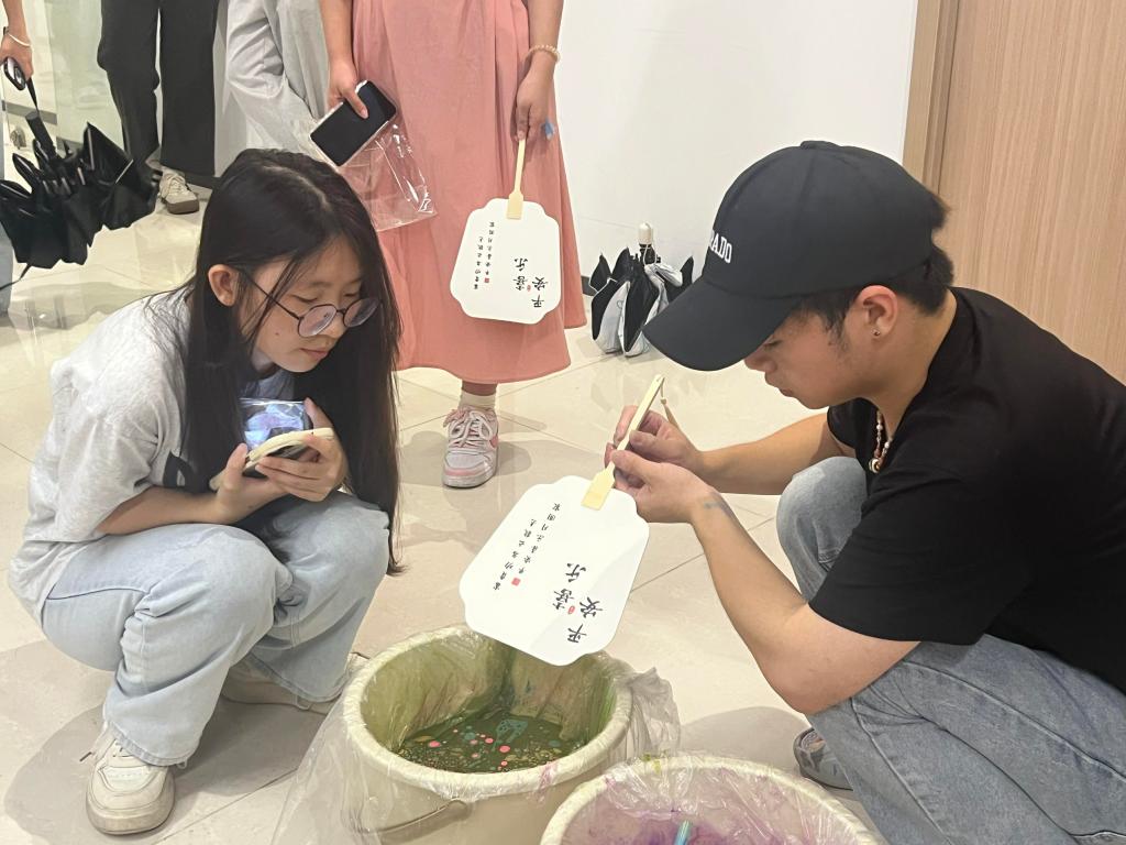在专业人员的引导下,同学们将油漆以“逐滴滴落” 方式注入水中,使油漆在水面形成厚薄不均的彩色油膜。待水面油膜稳定后,参与者手持扇柄将扇面水平切入水中,确保油膜均匀附着于扇面。上漆过程中,工作人员全程指导调整浸漆角度与停留时间(约 10-15 秒),避免油漆过厚导致干燥后开裂。