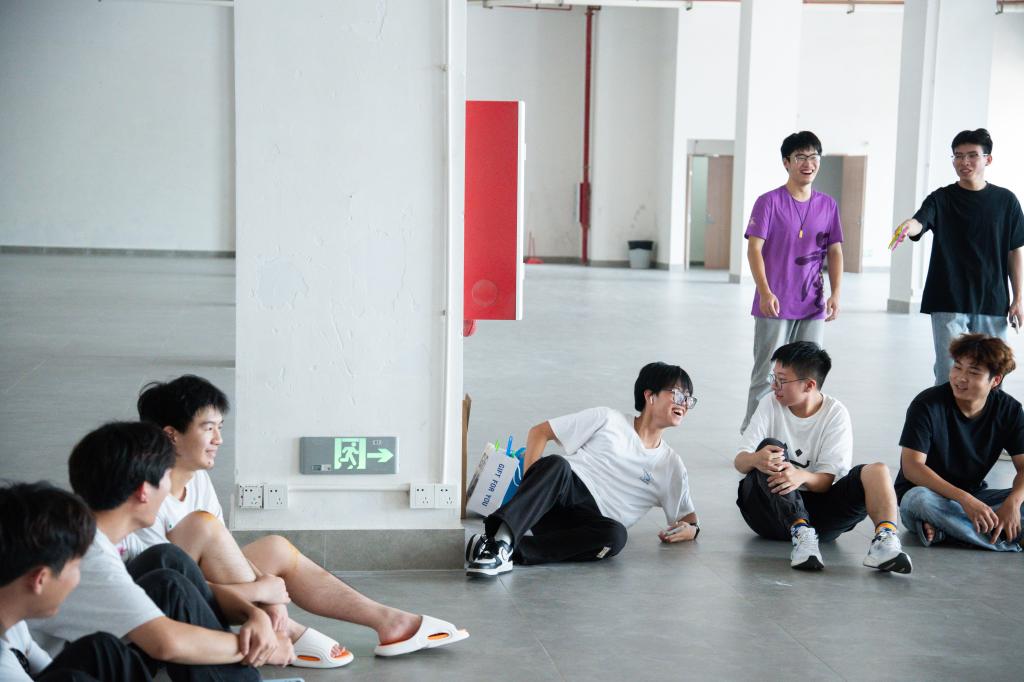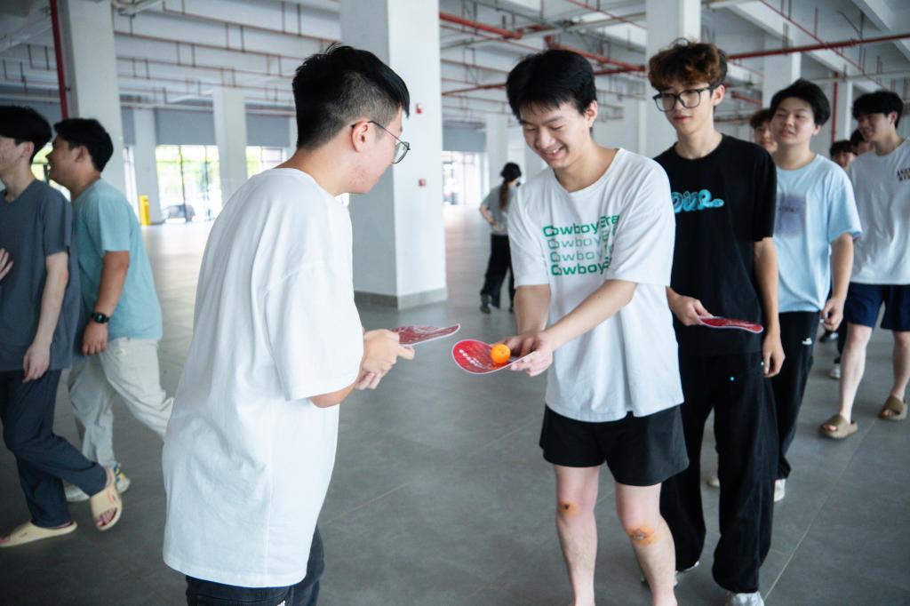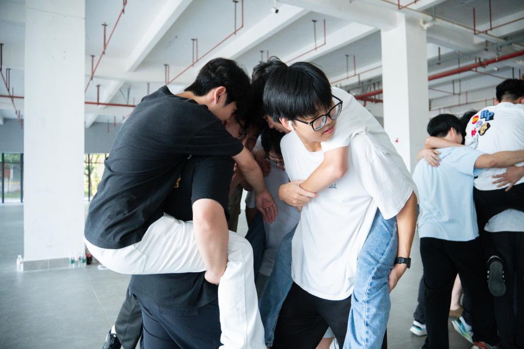 旨在锻炼同学们创新与策略思维,增强抗压与应变。每组八个人,小组想办法让更多的人站到纸板上获救,看哪一组获救的人最多且坚持时间最长。