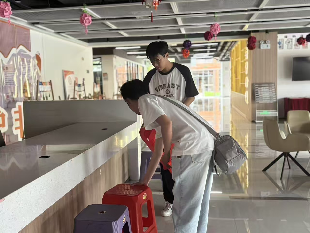 17:00,广汉书院的工作人员正进行最后的场地布置,包括摆放游戏道具、张贴指引标识、确认各区域准备就绪,以确保活动顺利进行,为同学们带来愉快的游园体验。