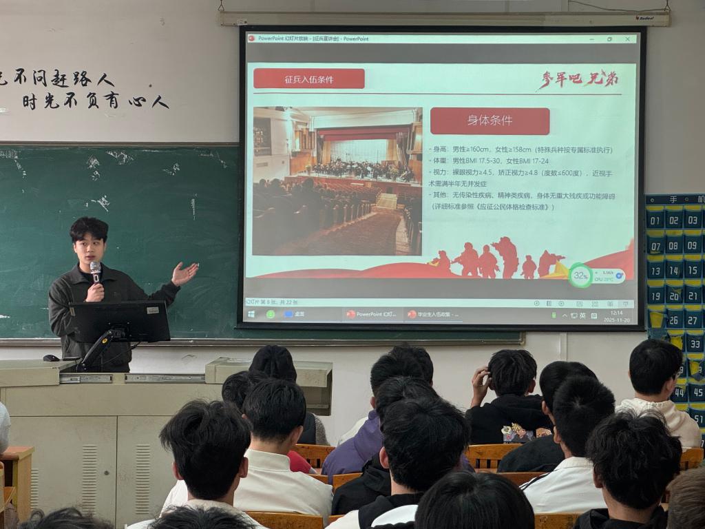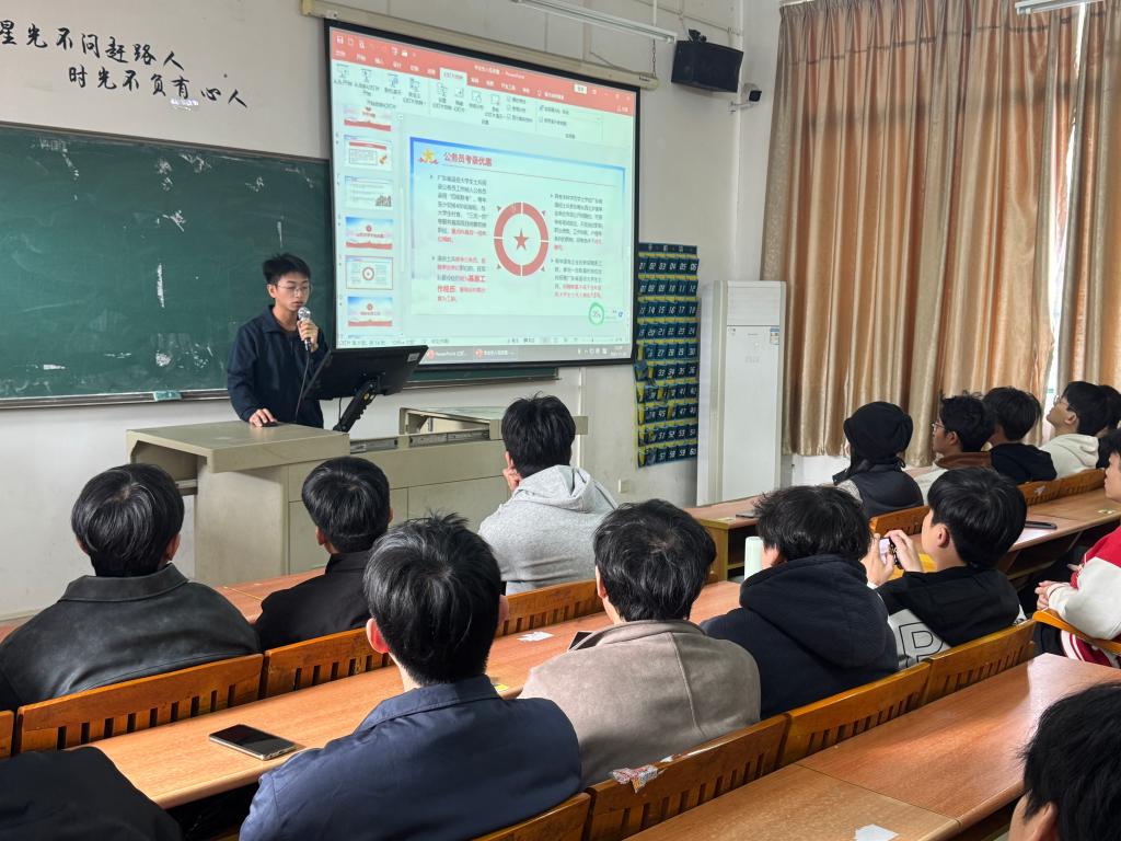 宣讲会上,退役学生服务队骨干成员首先对应征入伍的具体条件、报名流程及优待政策进行了系统梳理。讲解不仅涵盖了政治考核、体格检查等基本要求,更重点结合毕业生关心的学业发展与职业规划,详细解读了学费补偿代偿、考研加分、专升本优惠、公务员及事业单位定向招录等优待政策。为使讲解更具针对性,主讲人特别以增城区入伍政策为例,通过详实案例分析,让同学们对经济补助、退役安置等关键信息有了清晰认识。