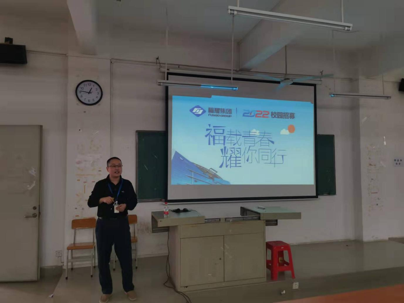 2021年11月17日下中午12:40分,广州福耀玻璃有限公司在博C301召开毕业生宣讲会,参会的领导嘉宾有:广州福耀玻璃有限公司林保勇经理、公司宣讲师李宁先生,宣讲会由李先生向19级学子就企业概况、未来发展及上升路径作详细讲解。