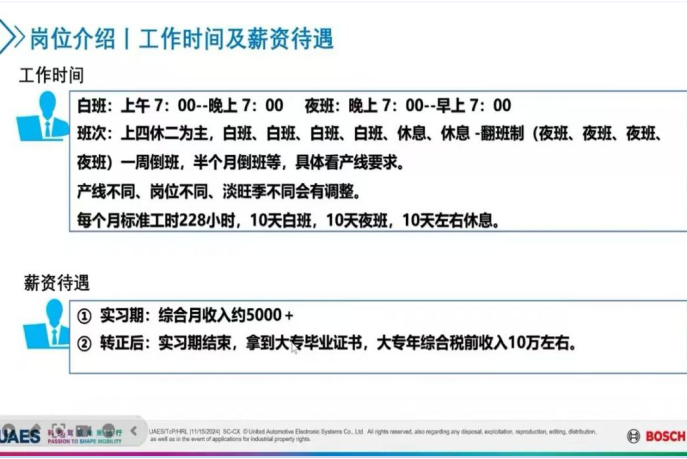 在岗位介绍环节中,UAES详细说明了招聘岗位,包括一线操作工、返修工和维修技术员,并介绍了这些岗位的职责要求、晋升通道、工作时间和薪资福利。公司采用“上十休二”的工作制度,月标准工时为228小时。实习期月收入约5000元,转正后年综合收入可达10万元。实习生基础薪资为每小时22元,并享有节假日福利,转正后员工则享有更完善的福利方案和晋升机会。