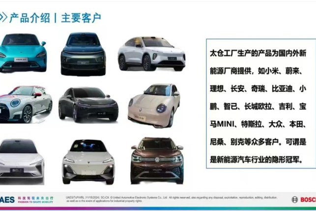 在随后的介绍中,专员提到UAES的主要客户群体,包括国内外多个知名汽车品牌和新能源厂商如;小米、蔚来、理想、长安、奇瑞、比亚迪、小鹏、吉利、宝马、特斯拉、大众、本田、日产、别克等等,彰显了企业在行业中的广泛影响力。
