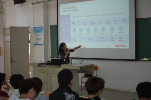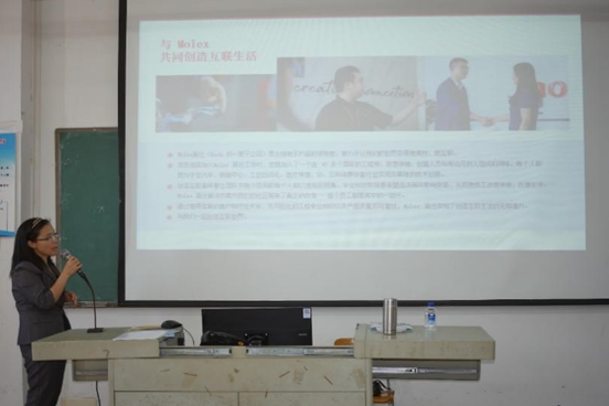 会议伊始,曾女士通过企业宣传视频向在场的师生介绍了公司的企业文化、发展历程和业务。东莞莫仕连接器有限公司成立于1988年,是美国Molex在中国设立的第一家生产基地,主要生产线束、连接器、PCBA、光缆、薄膜开关等产品,广泛用于高端通讯、家电、汽车、医疗、工业等领域,在业内享有极高的荣誉。随着企业宣传视频的结束,曾女士提出三个问题,在场的同学们积极举手回答,让现场的气氛活跃了起来。