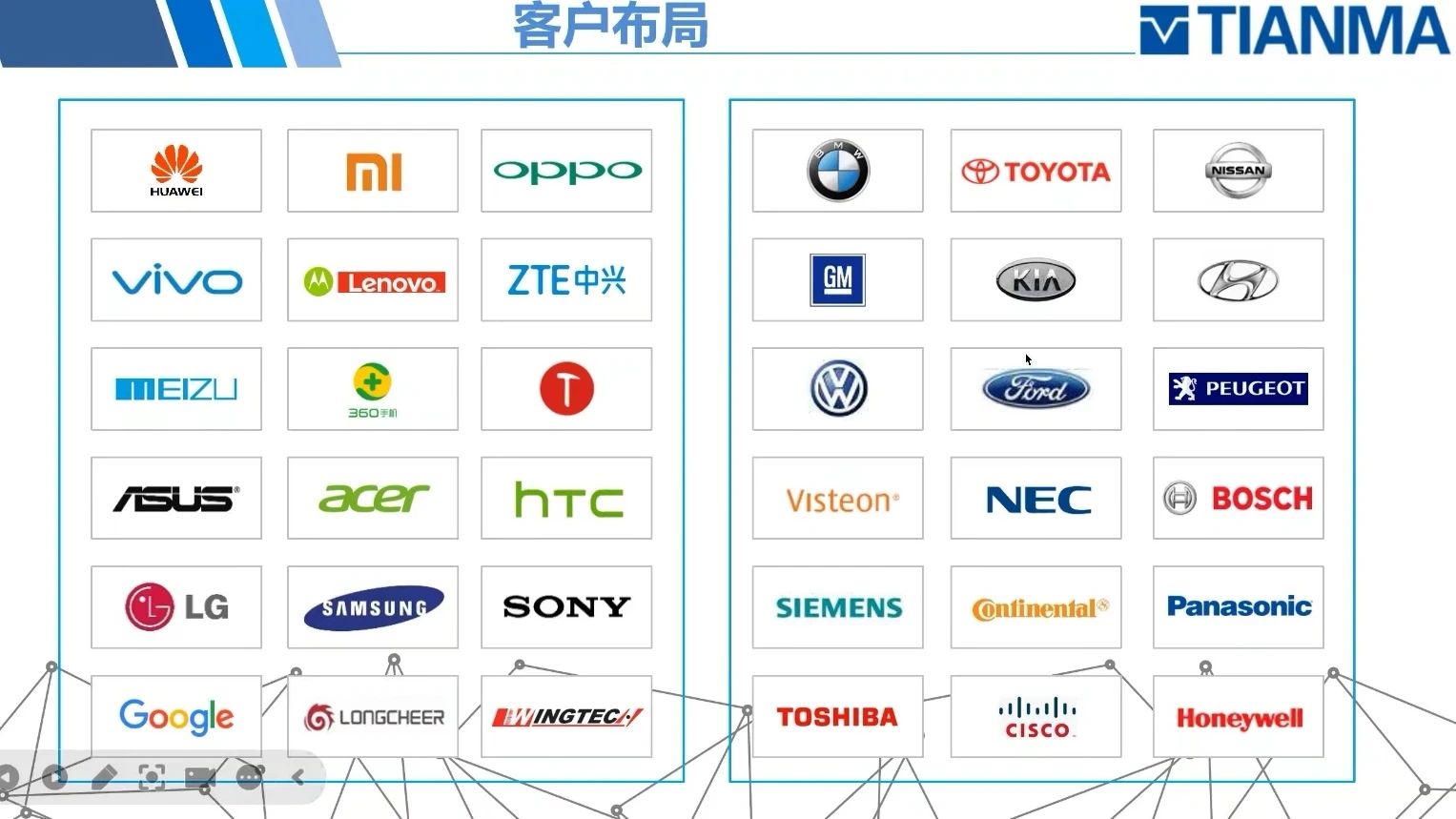 然后,在专员的介绍中,专员提到了天马微电子股份有限公司的主要客户群体,包括国内外多个知名手机品牌华为、小米、OPPO、VIVO、三星等,和汽车品牌宝马、丰田、日产、起亚、现代、大众、福特、标志等等,彰显了企业在行业中的广泛影响力。