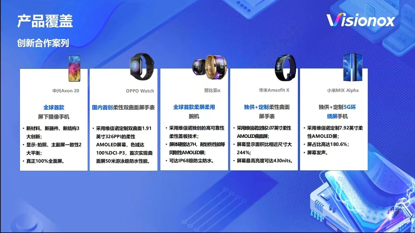 随后,在专员的介绍中,专员提到了广州国显科技有限公司的合作的产品有中兴Alone20全球首款屏下摄影手机、OPPOWatch国内首创柔性双曲面屏手表、努比亚a全球首款柔屏柔用腕机、华米AmazingX独供+定制柔性曲面屏手表、小米MIX Alpha独供+定制5G环绕屏手机等等,彰显了企业在行业中的广泛影响力。