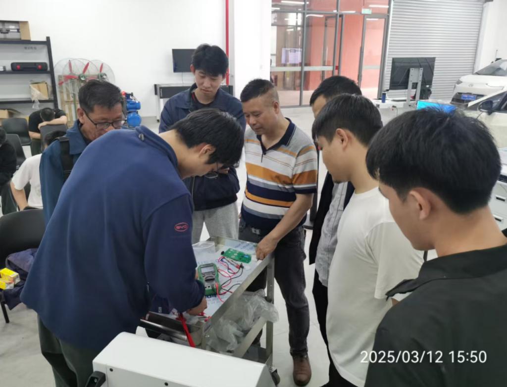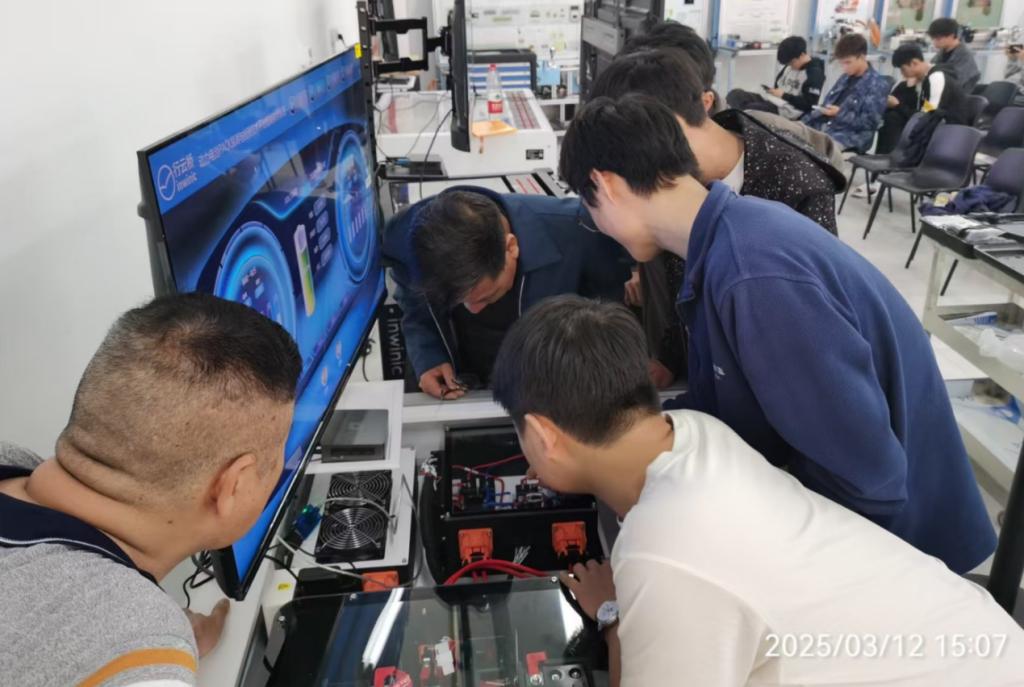2025年3月12日下午,比亚迪产业学院实训室里气氛热烈,一场聚焦新能源汽车技术革新的设备使用培训正在举行。来自全校汽车专业的教师齐聚一堂,共同体验学生移动魔盒终端、动力电池PACK装调与检测技术平台、驱动控制策略实训台智能教学系统V1.0、交直流充电智能实训台智能教学系统V1.0、教师控制终端-新能源汽车故障检测交互教学实训系统等“黑科技”设备,以“零距离”互动模式解锁教学新场景。