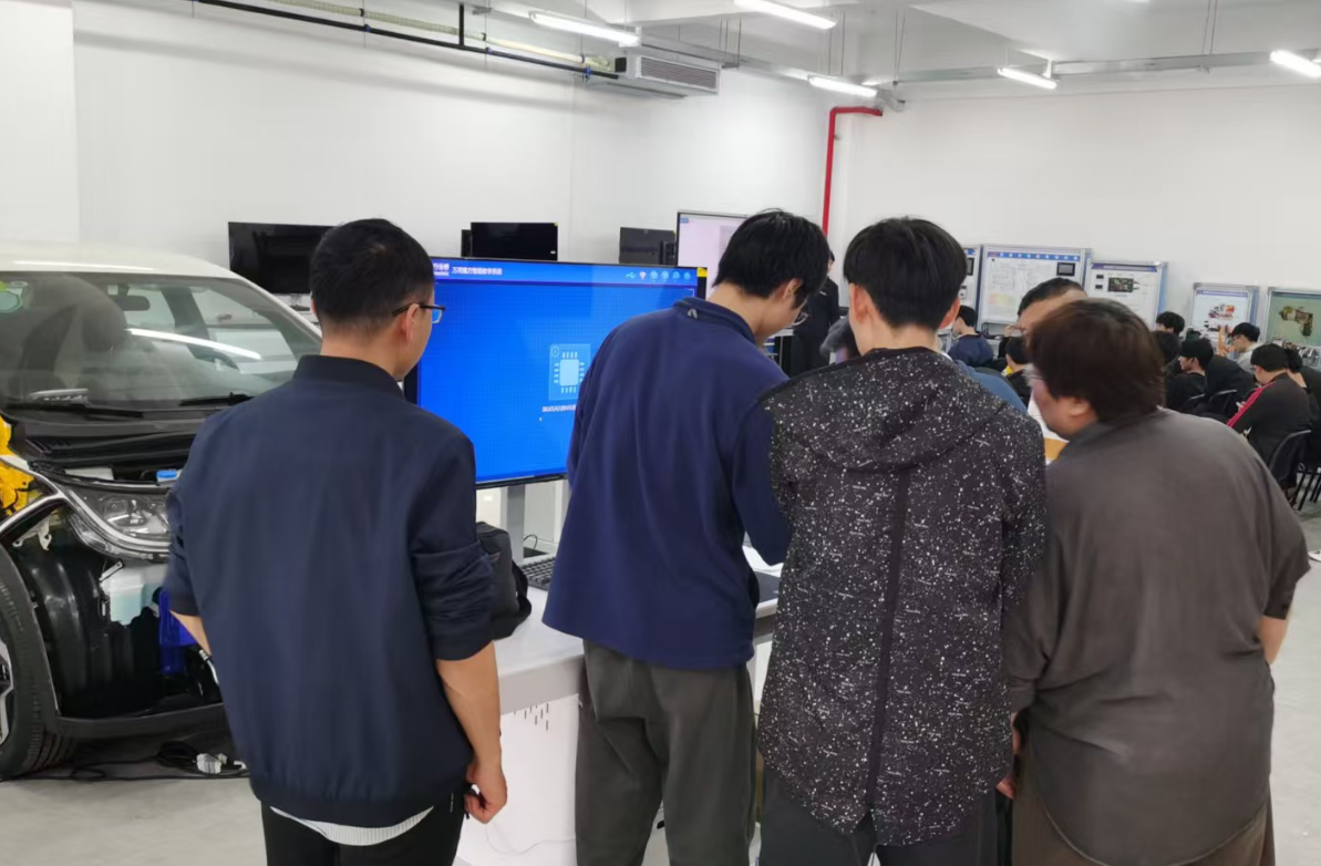 培训现场,教师们通过智能教学系统V1.0,实时模拟动力电池故障检测、驱动控制策略优化、交直流充电、新能源汽车故障检测等实操流程,指尖跃动的不仅是代码与数据,更是新能源汽车行业前沿技术的脉搏。其中,学生移动魔盒终端以交互式教学模式,将抽象的理论转化为具象的故障诊断场景,让教师们直观感受“教、学、练、测”一体化的教学魅力。