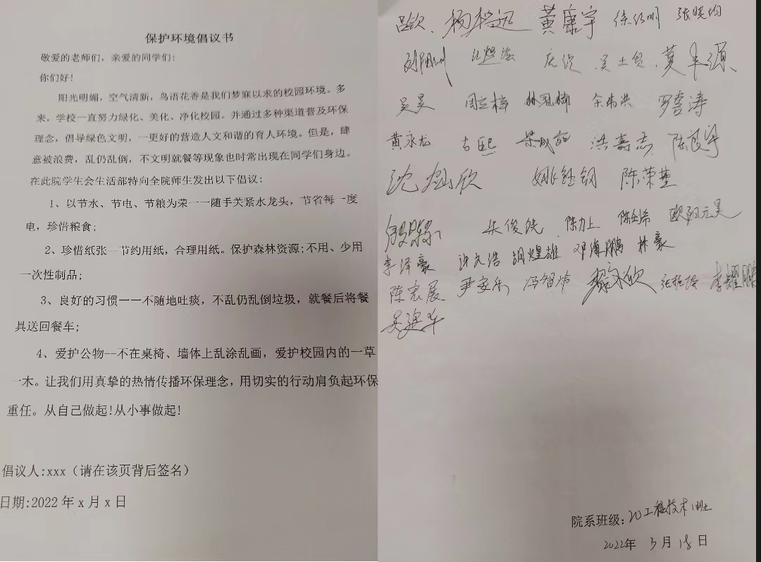 阳光明媚,空气清新,鸟语花香是我们梦寐以求的校园环境。多来,学校一直努力绿化、美化、净化校园。并通过多种渠道普及环保理念,倡导绿色文明,一更好的营造人文和谐的育人环境。但是,肆意被浪费,乱仍乱倒,不文明就餐等现象也时常出现在同学们身边。在此院学生会生活部特向全院师生发出以下倡议: