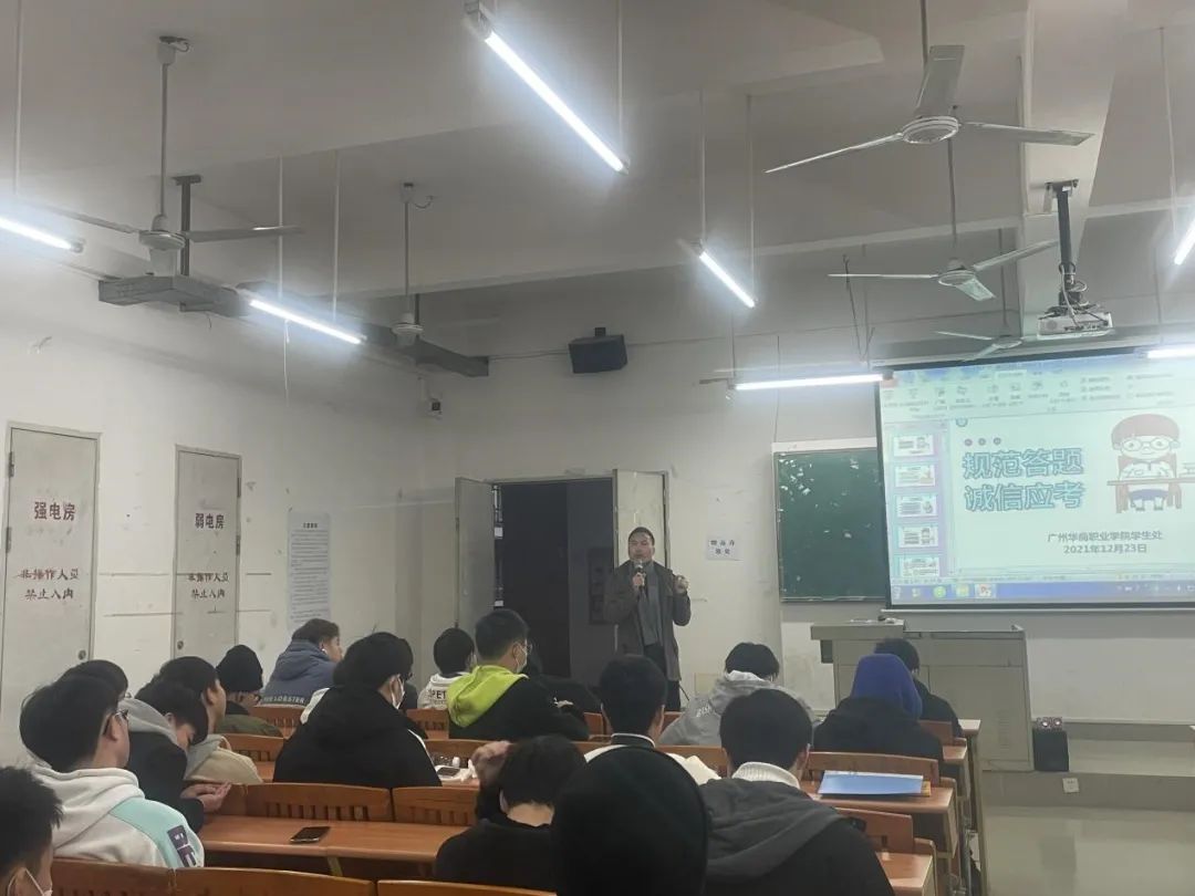 第三:临近学期末,各科的考试即将开始,学生也做好了迎接考试的准备,学工团队和班主任纷纷进入课室,给同学们开展“诚信考试”主题教育,提醒每位学生沉着冷静应对考试,遵守考试考风考纪,争做新时代优秀的大学生。