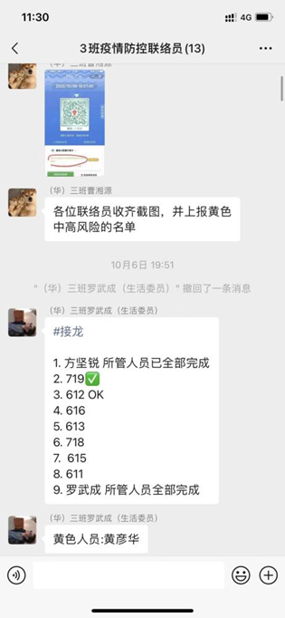 疫情之下,每一个环节都是在与时间赛跑,随着疫情防控状态的升级,核酸检测成为疫情防控的一个重要环节。从6月份运用“团体码”以来,班级网格化管理小组组长能轻松实现对全班同学的信息统计看板,包括健康码详细信息、核酸采样信息、疫苗接种情况等,组长能通过平台可迅速查看详细信息,一目了然,方便实时做好督促提醒。“之前排查是否班里同学都做核酸,只能根据收集的核酸采样截图记录,但是并不能真正排查到各位同学交上来的是否真实,而且统计整理这些核酸检测数据每天要花1-2个小时,焦头烂额,还非常容易出错,现在只要点开团体码,随时可查看未检测学生具体名单,点对点提醒,轻轻松松不漏一人,解放了双手也减轻了压力。”班长方坚锐介绍道。