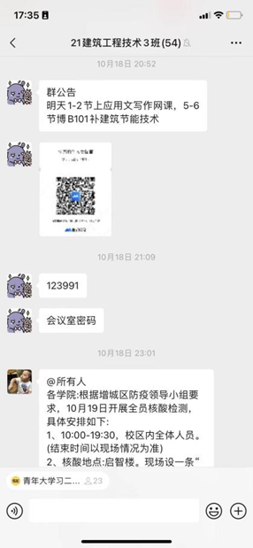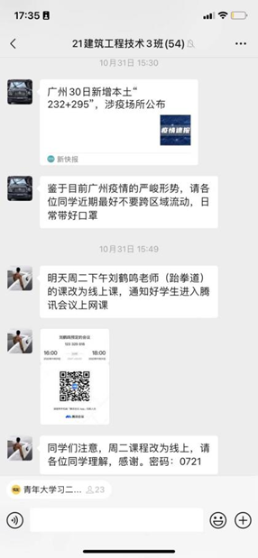 近日来,因黄码、小区封控等原因居家健康监测,少数任课老师和同学无法到校,所以班级做好随时启动线上教学的准备。班委们积极联系任课老师,提前了解网上教学需求,积极对接线上教学平台,做好各类网络教学资源和教学平台的技术支持和保障工作,对涉疫地区无法到校同学进行线上指导,竭力保证他们在特殊时期教学保质、保量、保进度。