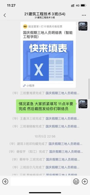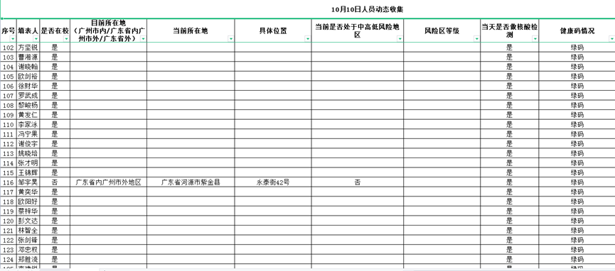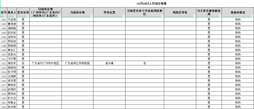 当前,广州市疫情防控形势严峻,防疫宣传、掌握人员动向、做好核酸登记、信息摸排等,这些日常的疫情防控工作尤为重要。21工程技术3班运用“接龙管家”小程序进行每日三地人员(广州市内/广东省内广州市外/广东省外)信息摸排,根据市防疫办要求不断完善小程序的相关内容。信息收集从“线下”转到“线上”,信息摸排工作省时高效、精准安全。班长方坚锐表示,“因为我们班级人员宿舍较为分散,给信息的收集、汇总、整理带来相当大的难度。这款小程序减轻了工作负担,提高了工作效率,我们在后台可以看到登记的所有信息,还可以对信息进行筛选,工作起来更加快捷、高效、精准,是疫情防控大排查的得力助手。只要通知到位,我们基本可以在30分钟内完成50人的信息收集任务。”