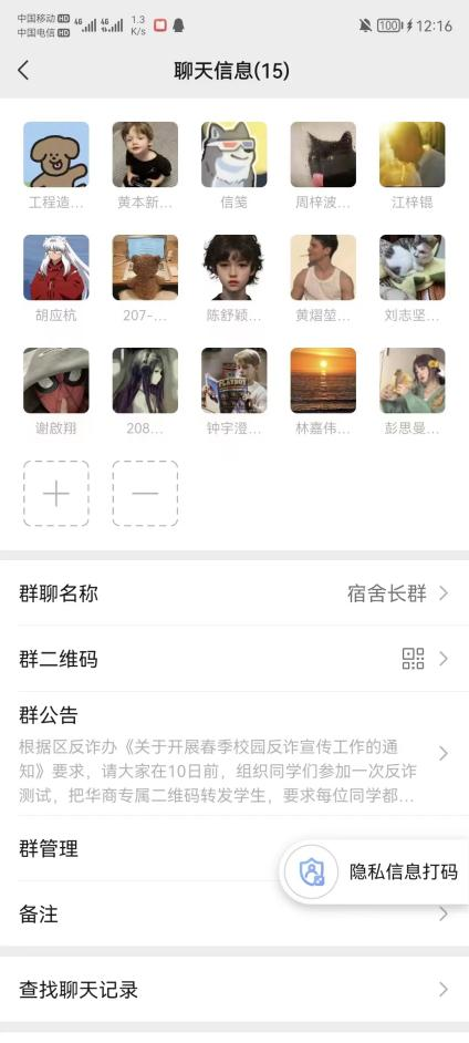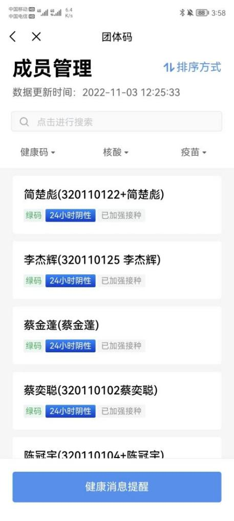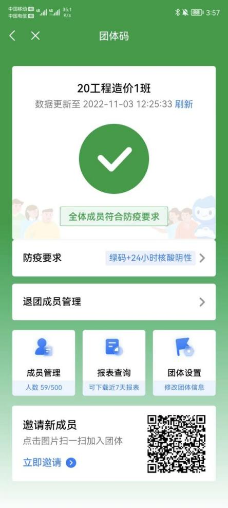 上学期期末,粤省事APP刚刚上线推出“团体码”这一全新功能,班长简楚彪率先组织班级59名同学加入团体码。因为班级的核酸检测完成情况可以通过团体码查询,能够做到有针对性的推进,如果班级成员核酸超时了,管理员还可以一键通知提醒同学们该去做核酸。在保障个人隐私安全、满足健康管理需求的同时,也减轻了管理负担,做到早发现、快围堵、迅速切断传播,让疫情防控更加精准、高效、便民。班长简楚彪每天定时查看粤省事团体码,导出数据查看,如发现尚未检测的同学或者健康码颜色异常时,第一时间联系该同学询问原因做好登记,并及时上报给辅导员。