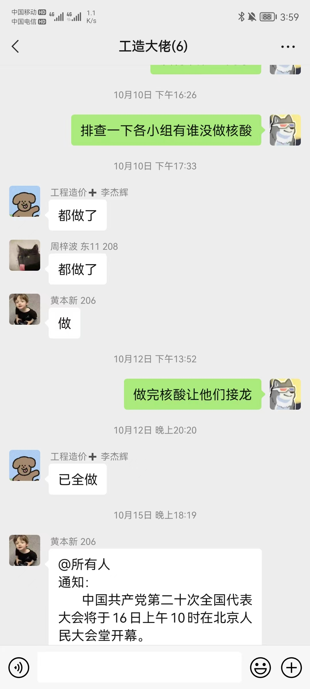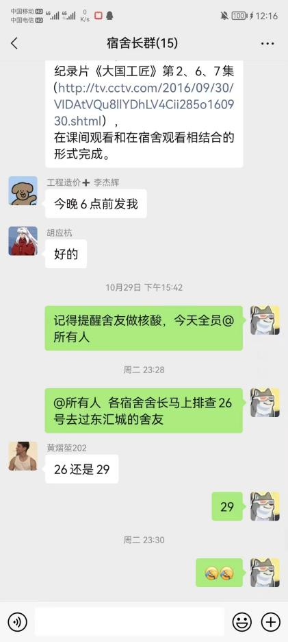 除了团体码,20工程造价1班积极落实网格化管理制度,班委作为网格管理员进行基层管理。结合班级学生住宿分布情况实际,以学生宿舍楼栋为基础,按就近、分类、便捷、高效的原则进行划分,六个班委每人平均负责近10名同学。各班委除负责小组成员核酸检测外,也负责节假日请假外出去向的跟进,并通过国家政务服务平台检查小组学生是否有管控、封控区旅居史;同时小组同学如有特殊情况会第一时间跟组长报备,组长再迅速上报。在日常全员核酸检测中,若在团体马上发现班级同学未完成核酸检测或者信息摸排未及时完成班级接龙,小组长就会采取“敲门行动”+“连环Call”,做到疫情防控不落下一人,筑牢疫情防控安全屏障。