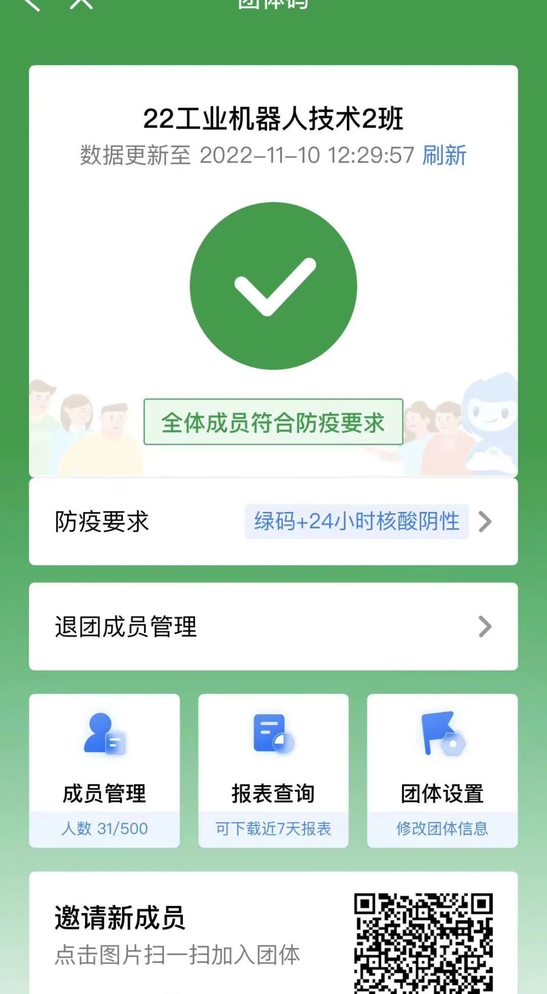 在疫情来势汹汹的同时,科技技术也在不断发展,为抗疫作出的贡献。“团体码”应时而生减轻防疫统计工作,管理人员可通过团体码实现实时确定同学们的健康信息、全局掌握团队健康情况。班长曾扬佩迅速组织全体同学加入团体码,通过团体码查看同学们的防疫工作。能够“码”上提醒同学们要去做核酸,如果有异常情况,可以及时通知落实到位,形成同学们少操心,管理员多放心的局面