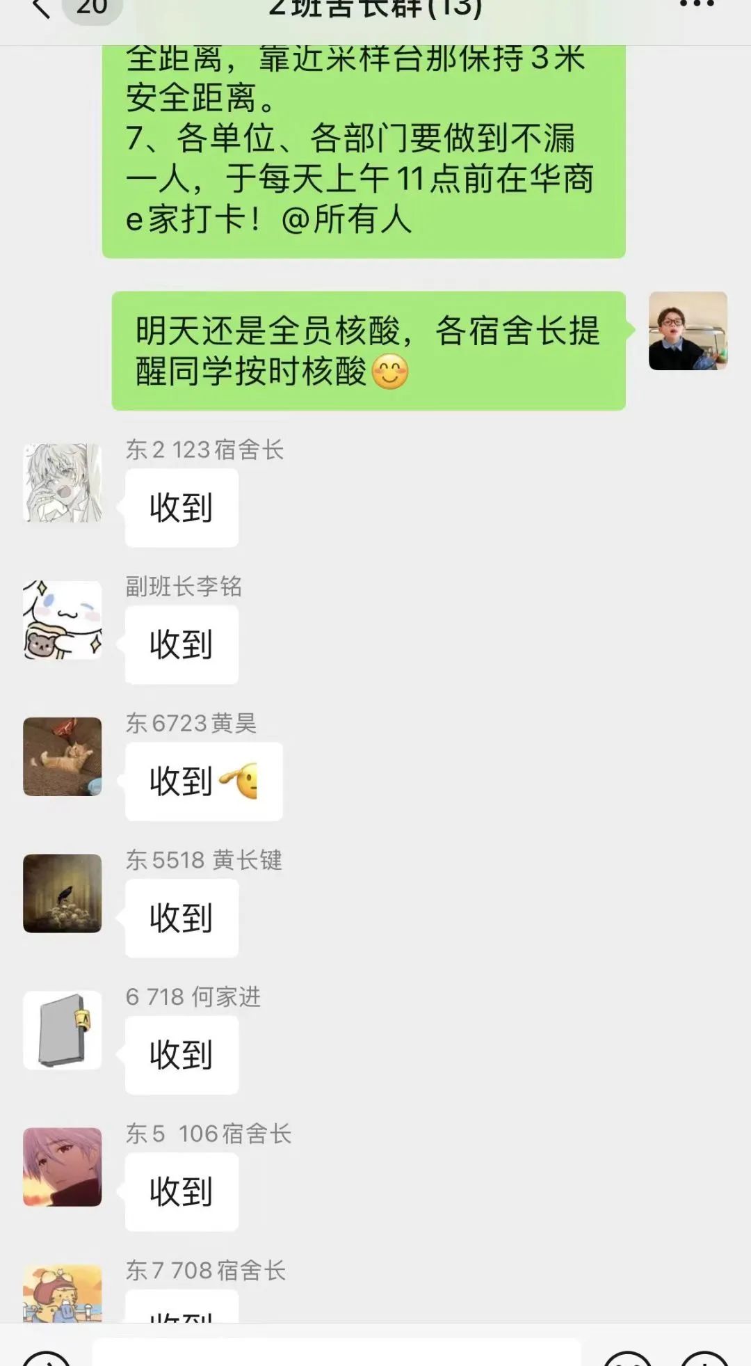 22工业机器人2班在辅导员曾斌的带领下,形成由辅导员→六名班委→宿舍长→宿舍成员逐级对接,层层抓落实,管控到个体的防疫体系。同时使用粤康码APP积极落实集团信收集,实现将疫情防控工作从发布到监管“一条龙”,为“防疫”工作筑起屏障。统计班级成员宿舍分布,以方便、就近,分发下至各宿舍长分别管理各自宿舍人员核酸检测及节假外出去向的监督及汇总上报。如果有漏报或者有未完成当日核酸接龙工作的,管理人员使用这一体系将工作通知告知每人,做到全面落实防控工作,为防疫工作修建起坚固的城墙。