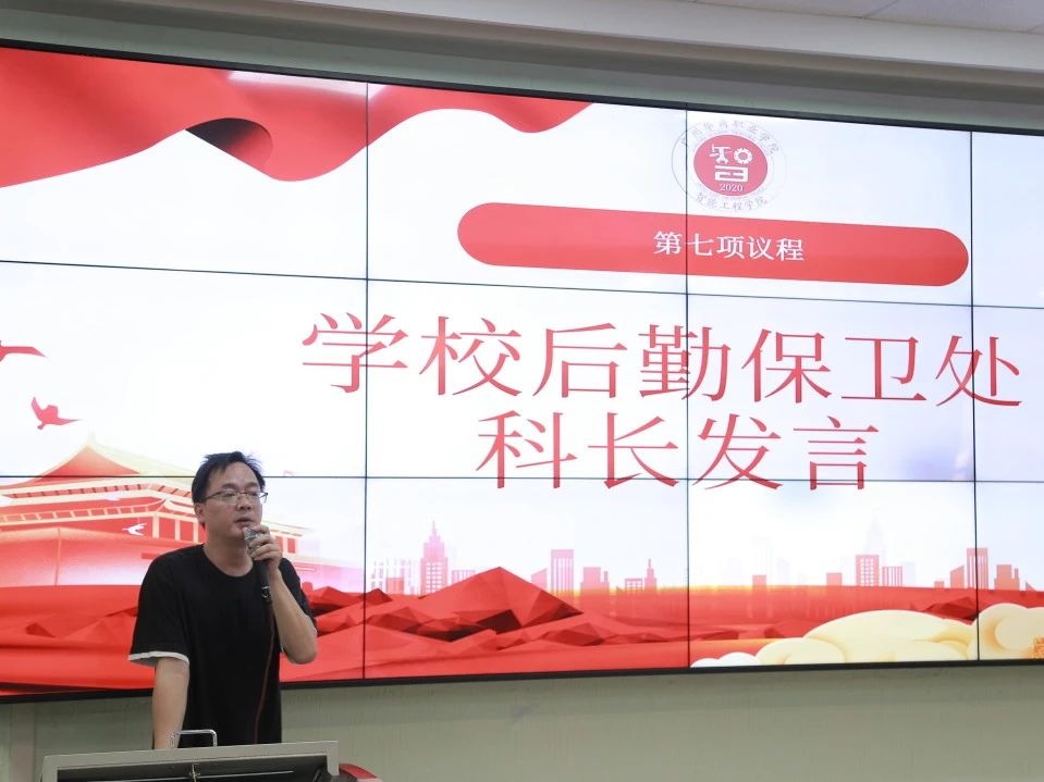 主持人黄琪琪同学介绍莅临本次会议领导与嘉宾,他们分别是智能工程学院党总支部副书记姚柏洲、学校后勤保卫处科长叶德志、学院学工助理张蒙莉、学生第一党支部书记魏文香、学生退役服务队指导老师曾斌及学院各辅导员老师。