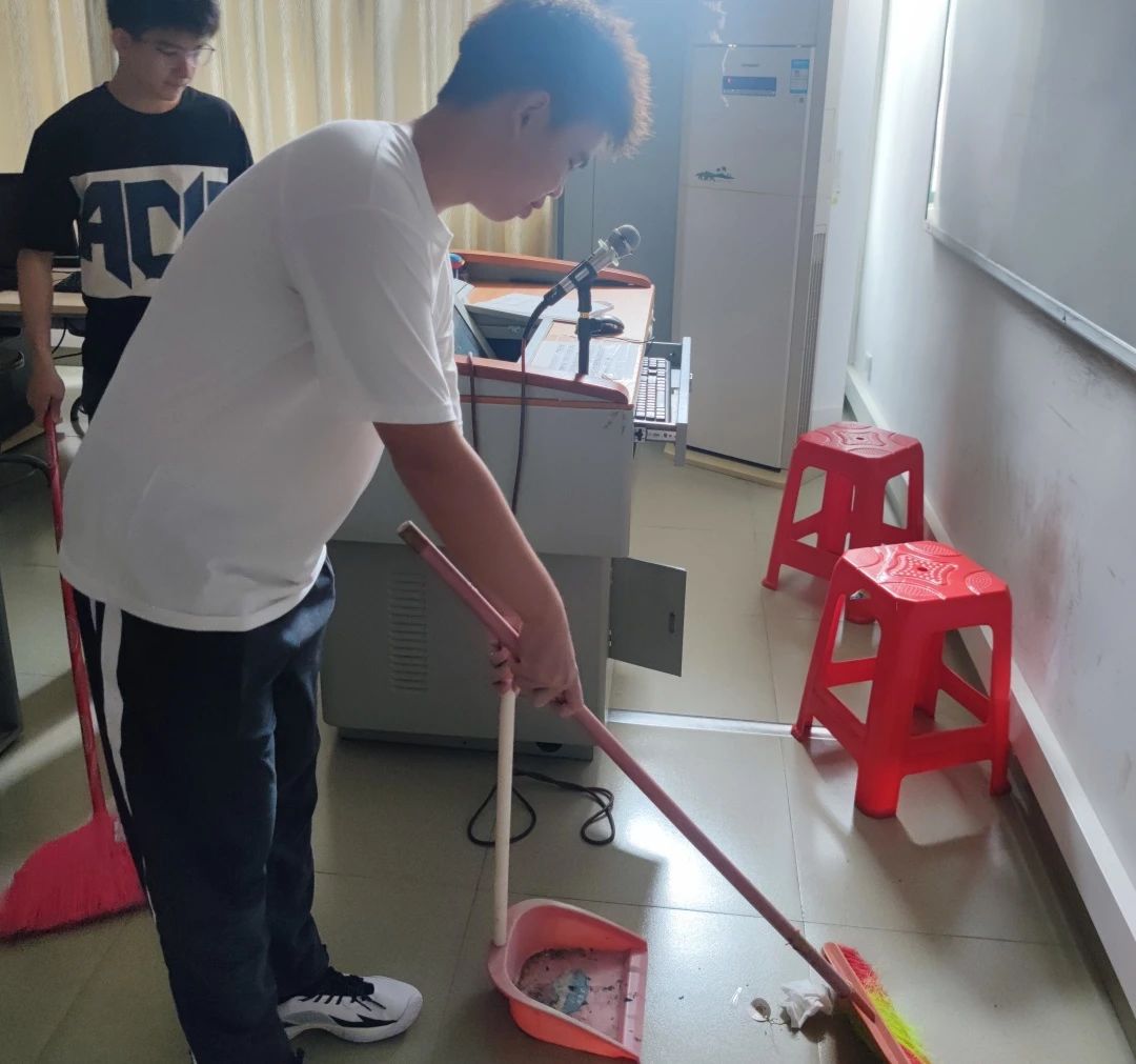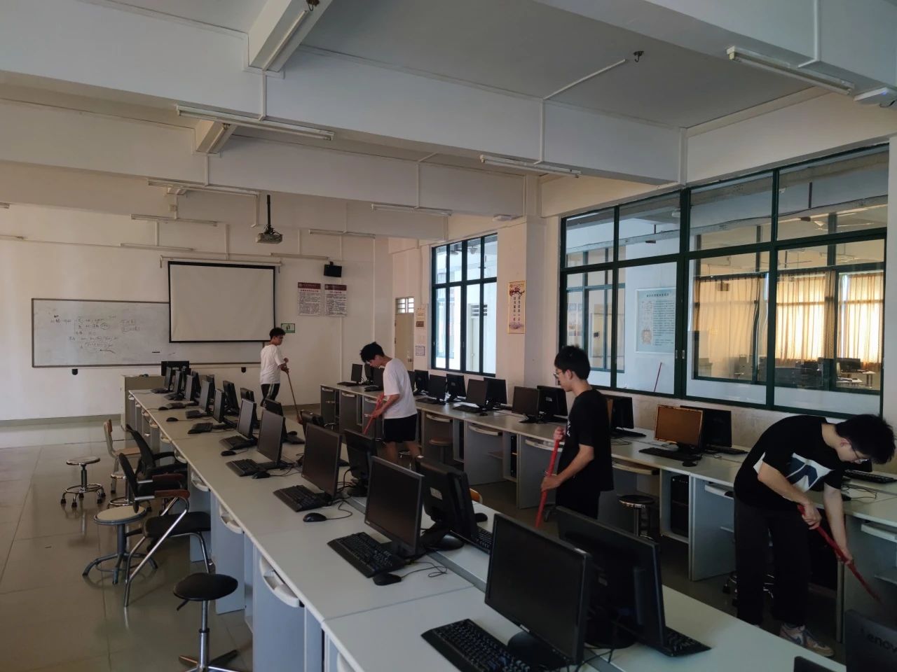 在清扫机房时,考虑到里面各种仪器的重要性,志愿者还会仔细地用扫把把垃圾扫起来,并且清扫结束后也会自觉将机房的凳子统一摆放整齐。