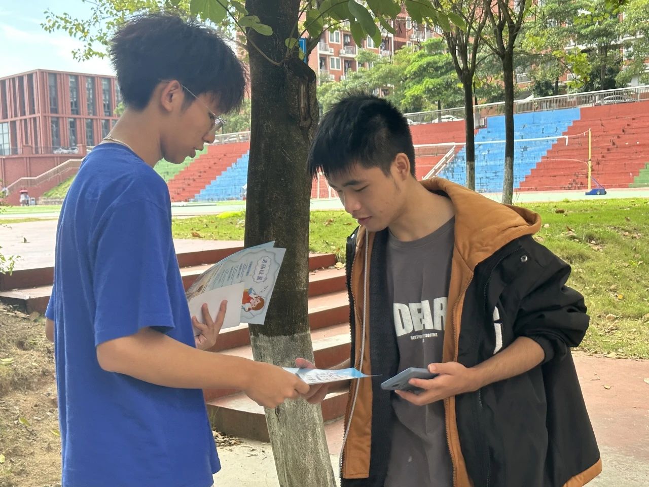 活动初期,志愿者们在学校主要路口摆摊,提前将准备好活动所需要的海报、横幅和礼品等宣传物资放置好,积极且耐心地跟有意愿的同学们讲解明信片绘制要求、上传形式和投票规则,传播积极向上的公益理念。路过摊位的同学们纷纷停下脚步,认真倾听并积极参与活动,两天的宣传活动中,明信片在一张张减少,参与热情却是在一点点升温。