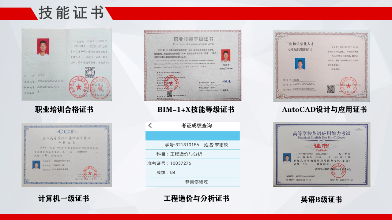 入学以来,宋志欢始终秉持着脚踏实地的学习态度和持之以恒的学习精神,坚持学业为重。重理论、重实践,学习成绩总分排名专业第一,综合测评连续两年中排名专业第一,连续两年荣获校级一等奖学金、连续两年荣获“学习标兵”、“全勤奖”,并努力考取多项职业技能证书,强化自身专业技能。