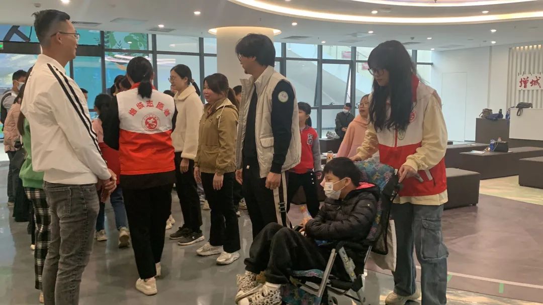 我们寓教于乐,小朋友们、家长和志愿者们一起在玩乐中学习。这里还有一位特别的小朋友,他坐在轮椅上前来参加活动,我们的志愿者们陪着这位小朋友加入了我们体验活动中来。