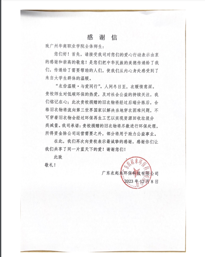 每一件旧衣物背后都有一个故事,当这些衣物得到了新的归宿,故事也得以延续。活动中收集的所有衣物,在经过志愿者整理过后统一交于广东衣起来环保科技有限公司,以环保再生—环保再造—旧衣出口的方式,实现旧衣的资源循环利用,促进生态保护和绿色发展,以下是受赠公司致我校全体师生的感谢信: