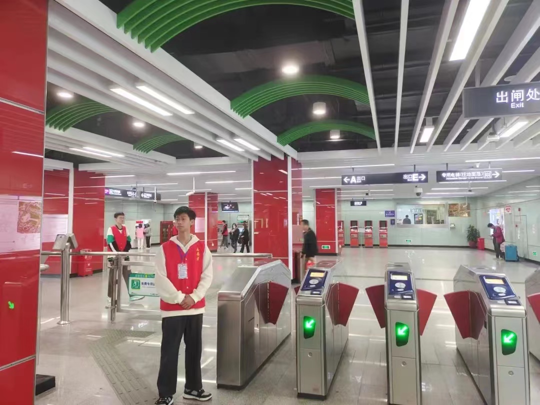 身穿红马甲的志愿者在各站口耐心地为乘客提供引导和咨询服务,避免拥挤和推搡等危险现象的出现。