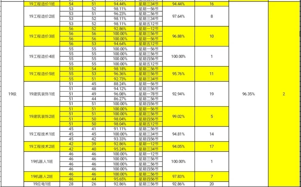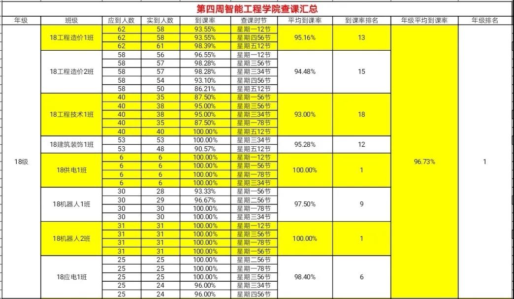 智能工程学院团总支办公室纪检部和学生会生活部的干部们,对我院进行第四周的学生到课率统计,现公布第四周的查课汇总情况。