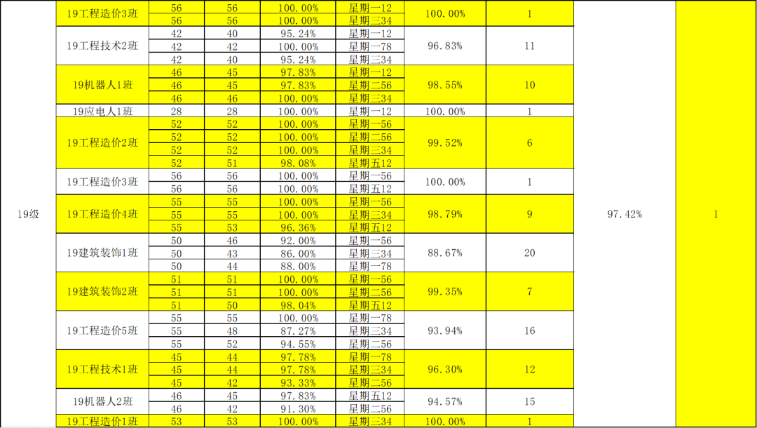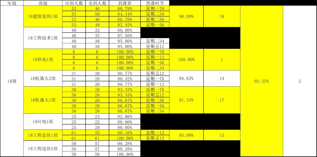 智能工程学院团总支办公室纪检部和学生会生活部的干部们,对我院进行第五、六周的学生到课率统计,现公布第五、六周的查课汇总情况。