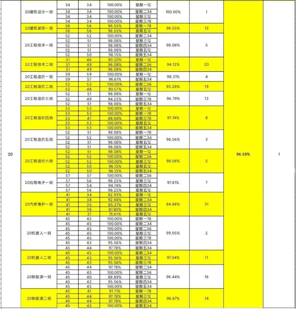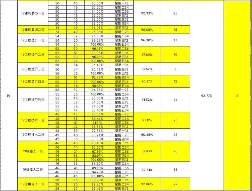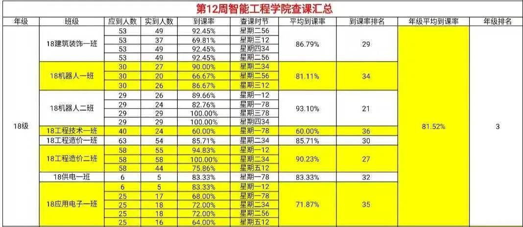 智能工程学院团总支办公室纪检部和学生会生活部的干部们,对我院进行第十二周的学生到课率统计,现公布第十二周的查课汇总情况。