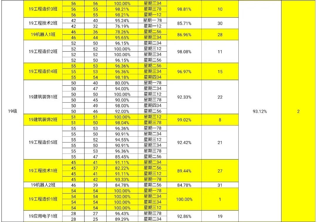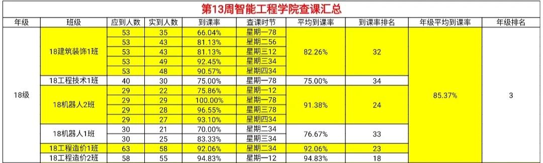 智能工程学院团总支办公室纪检部和学生会生活部的干部们,对我院进行第十三周的学生到课率统计,现公布第十三周的查课汇总情况。