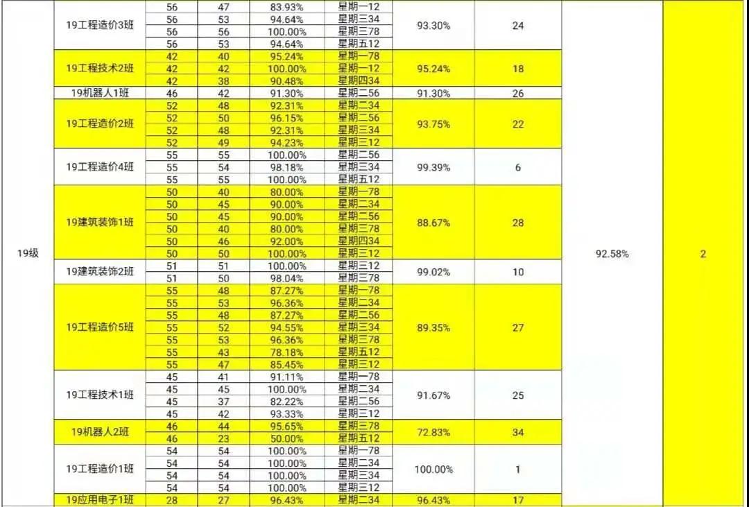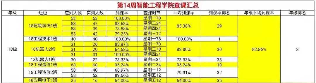 智能工程学院团总支办公室纪检部和学生会生活部的干部们,对我院进行第十四周的学生到课率统计,现公布第十四周的查课汇总情况。