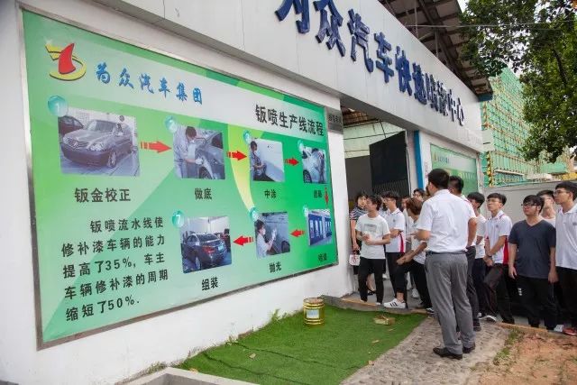参观领队结合图文对我们讲解了钣金喷涂对车辆修复的标准流程,同时介绍了为众汽车集团独有的快速喷涂技术。出于对我们身体健康的考虑,参观领队拒绝了我们无防护地进入参观。
