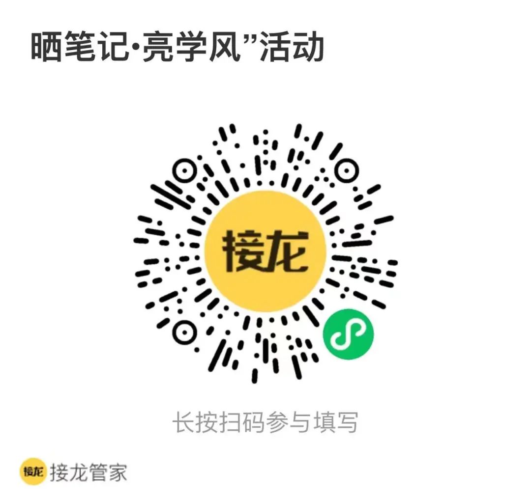 通过公众号推文的形式,以报名接龙的形式征集作品,活动名额500个,先报名成功者优先后续会在参赛作品中挑选部分优秀笔记进行颁奖、展览、分享注意:姓名、班级、学号要以真实情况填写,一旦提交便不可修改,后果自负。