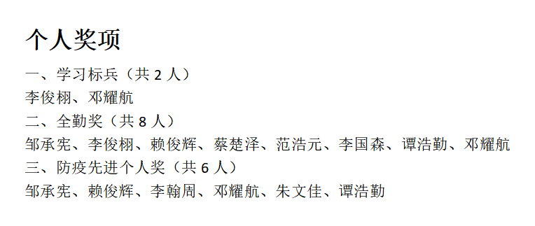 学习标兵共 2人、全勤奖共 8人、防疫先进个人奖共 6 人,显然,这些数据是我们能够当选先进班级的原因之一。