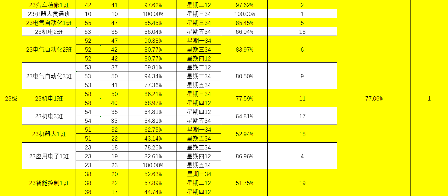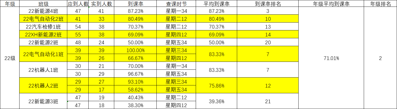 智能制造与汽车学院院团委的工作人员们对我院第十二周的学生课堂情况和学生到课率进行了统计。