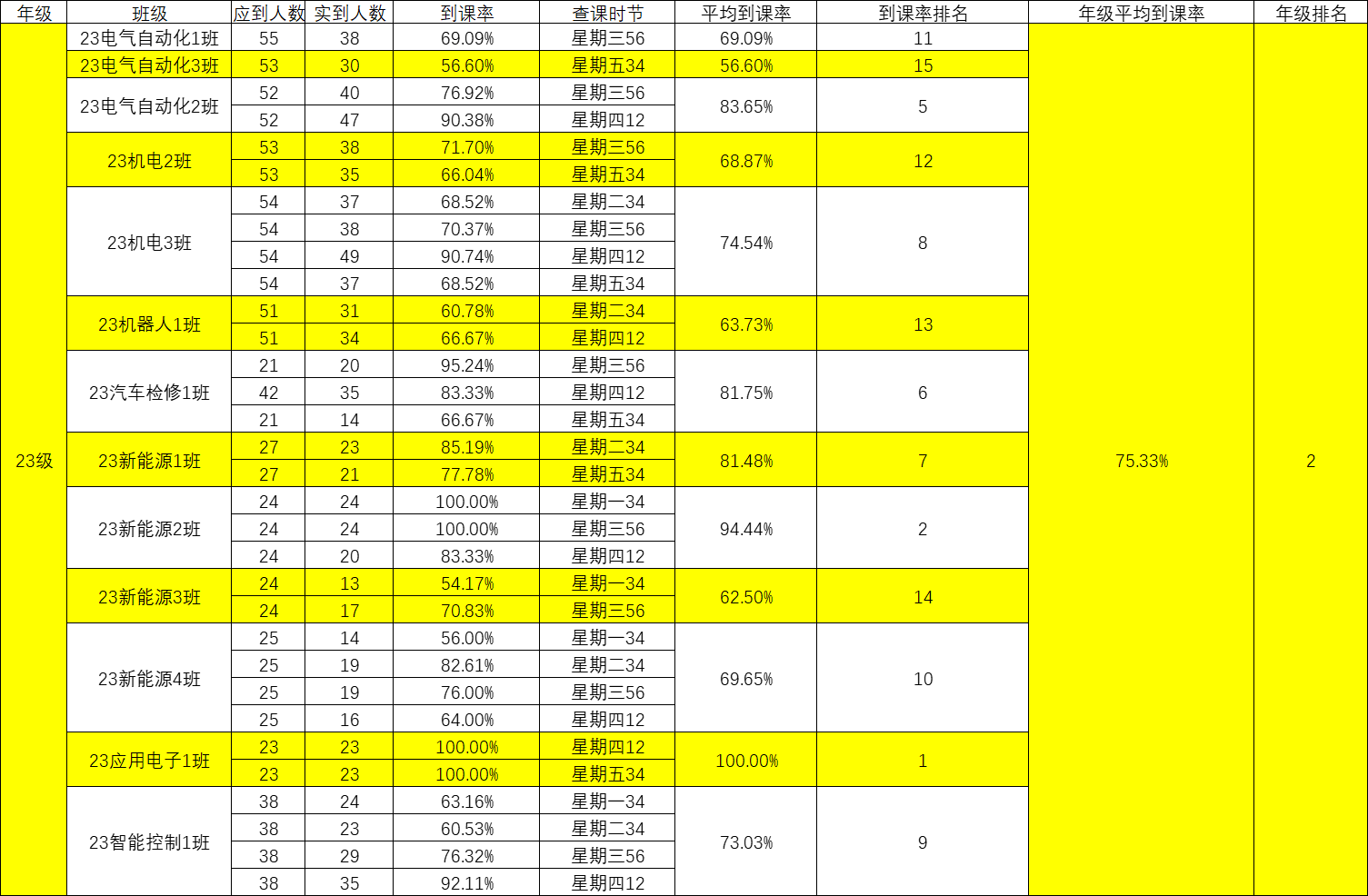 智能制造与汽车学院院团委的工作人员们对我院第十七周的学生课堂情况和学生到课率进行了统计。